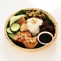 Nasi, Ayam Gepuk 1/4, Daging Dendeng, Keropok, Timun, Kobis Goreng, Tempe, Sambal Gesek/Gepuk